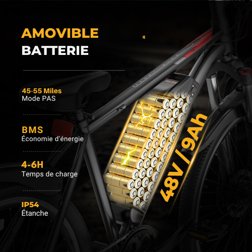 • Batterie : 48 V 9 Ah lithium-ion – autonomie 35-55 km / recharge ≈ 5 h