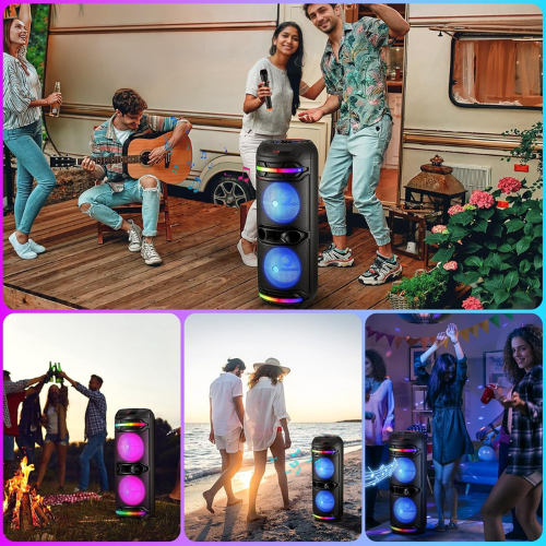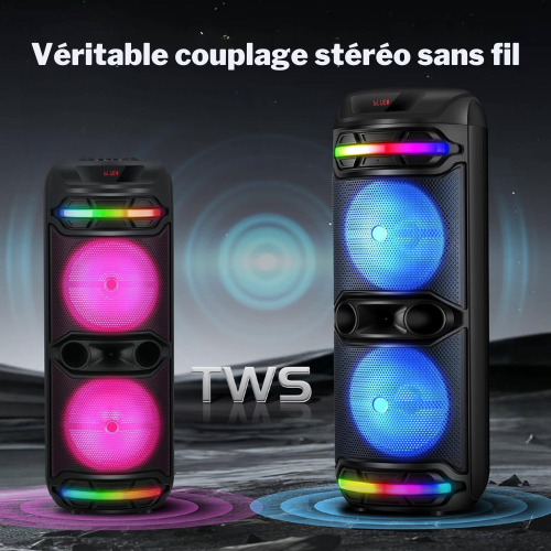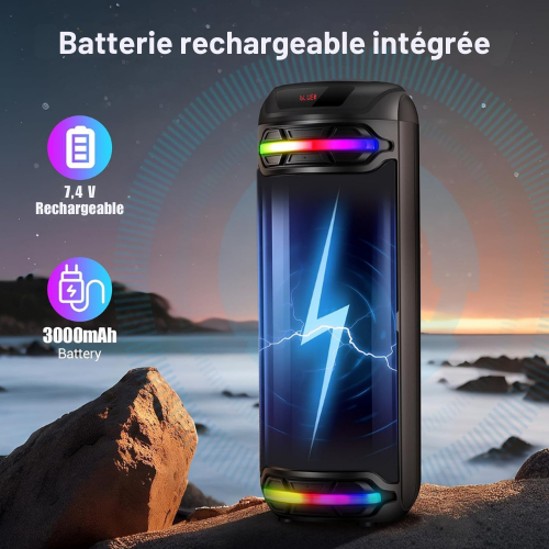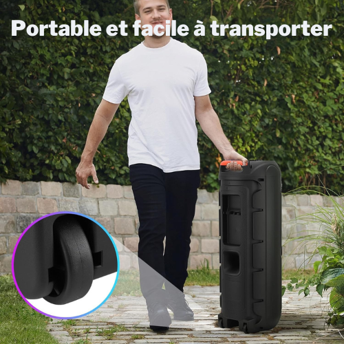 Les lumières LED dynamiques se synchronisent avec le rythme pour créer instantanément une ambiance festive. Le microphone sans fil et la télécommande inclus facilitent le karaoké, les animations et les événements.