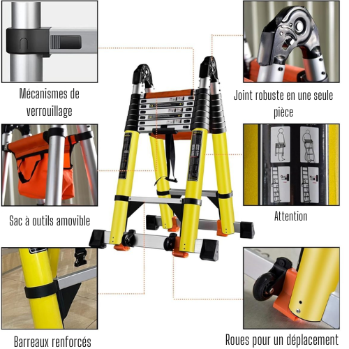 Chaque section est équipée de verrous renforcés et de loquets de sécurité pour une stabilité totale lors de l’utilisation. Les pieds antidérapants et la barre stabilisatrice assurent une adhérence optimale sur toutes les surfaces. Certifiée selon les normes EN 131 et CE, cette échelle répond aux exigences européennes en matière de sécurité et de qualité.
