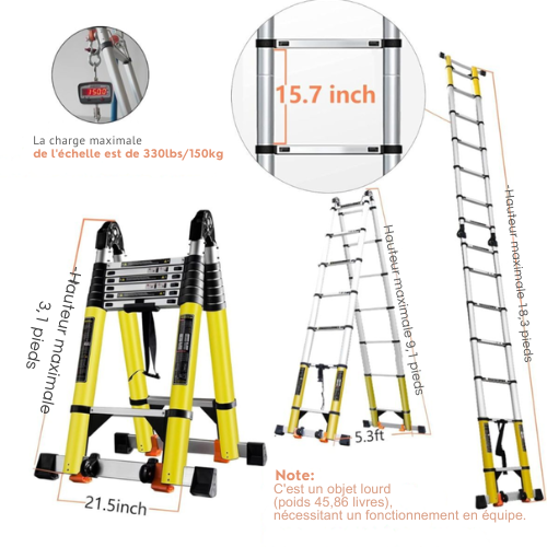 L’Échelle Télescopique Extend and Climb™ allie la robustesse d’un outil professionnel à la praticité d’un usage domestique. Fabriquée en alliage d’aluminium de haute qualité, elle supporte jusqu’à 150 kg et peut être utilisée aussi bien en échelle droite qu’en position A. Parfaite pour les travaux de rénovation, la peinture, l’entretien ou les chantiers, elle garantit fiabilité et sécurité en intérieur comme en extérieur.