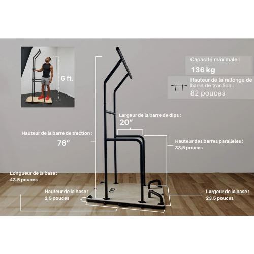- Accessoires optionnels : stabilisateurs, extensions, kit barre avec bandes