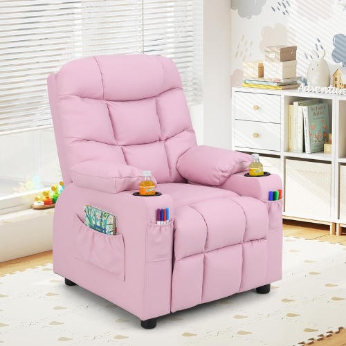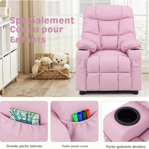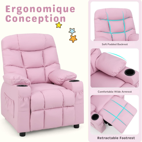 Chaque accoudoir intègre un porte-gobelet permettant aux enfants de garder leur boisson à portée de main. Une grande poche latérale et deux poches frontales offrent un espace pratique pour ranger livres, goûters ou petits jouets — tout reste bien organisé et accessible.