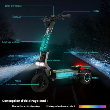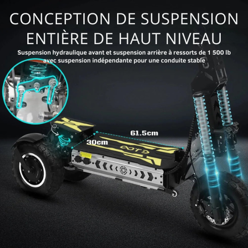 Profitez d’une conduite fluide et stable sur tous les terrains grâce à une double propulsion puissante, une suspension de précision et un freinage hydraulique réactif. Idéale pour les trajets urbains comme pour les escapades en plein air, cette trottinette offre une autonomie longue durée, une excellente adhérence et un design pliable pour un transport facile au quotidien.