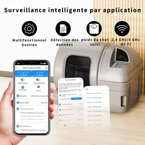 Connectez le Felinex™ à votre smartphone pour un contrôle total : nettoyage automatique, planification, notifications et suivi de la santé de votre chat en temps réel. Compatible avec les réseaux Wi-Fi 2,4 G et 5 G, l’application fournit des rapports sur la fréquence, la durée et le poids du chat à chaque utilisation. Conformité aux normes ETSI EN 300 328 pour la connectivité sans fil en Europe.