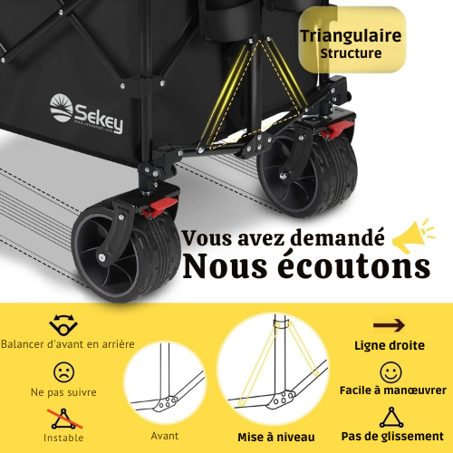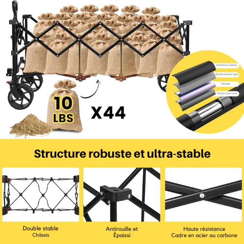 Découvrez le HaulMaster™ 48” Chariot Pliable — votre compagnon tout-terrain idéal pour les sorties en plein air, les voyages et les escapades en famille. Conçu pour offrir un maximum de capacité et de praticité, il allie robustesse industrielle et portabilité compacte. Que vous alliez à la plage, au camping, au marché ou au terrain de sport, ce chariot pliant supporte toutes les charges avec aisance et élégance.