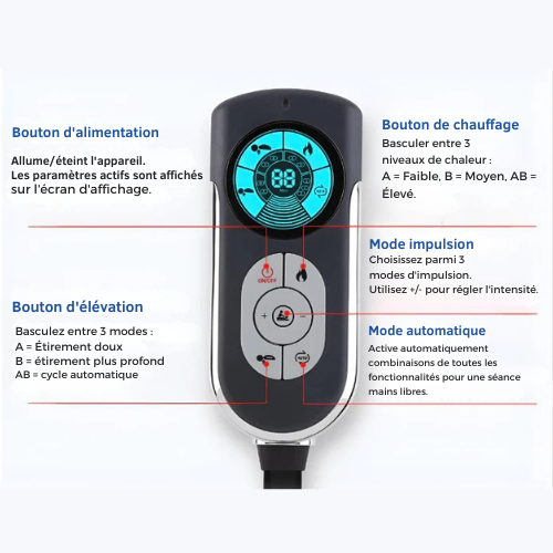 Grâce au contrôleur intelligent, combinez chaleur + élévation + impulsions dans une seule session, ou ajustez chaque fonction selon vos préférences. Simple, intuitif et pensé pour une utilisation quotidienne.