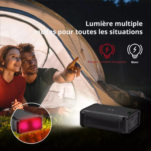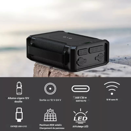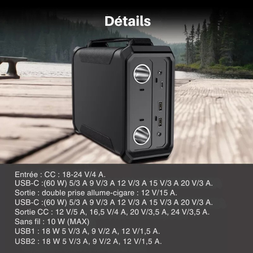 - Sorties : USB-C PD, 2× USB-A QC3.0, 2× ports 12V, sortie DC 12–24V