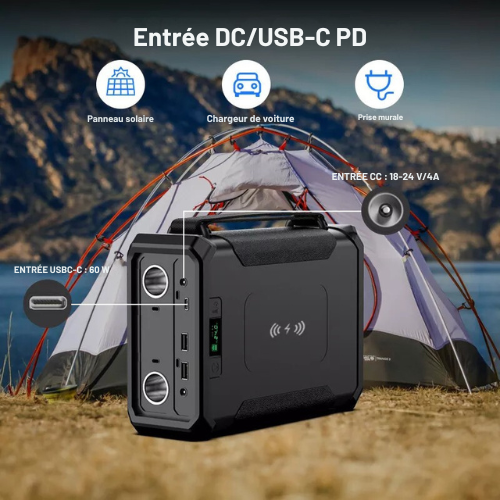 - Méthodes de charge : USB-C PD, chargeur DC, panneau solaire (MPPT)