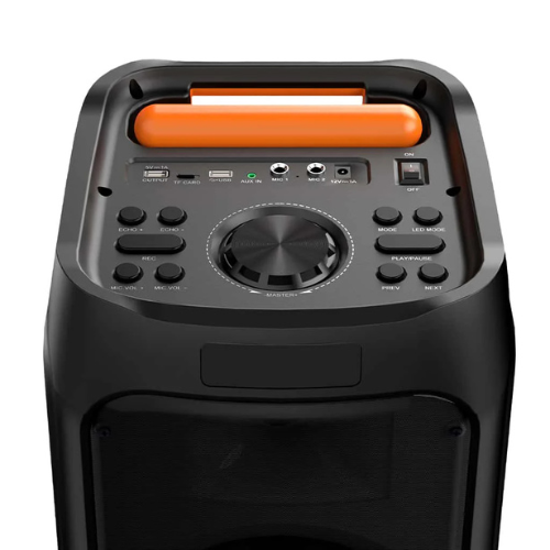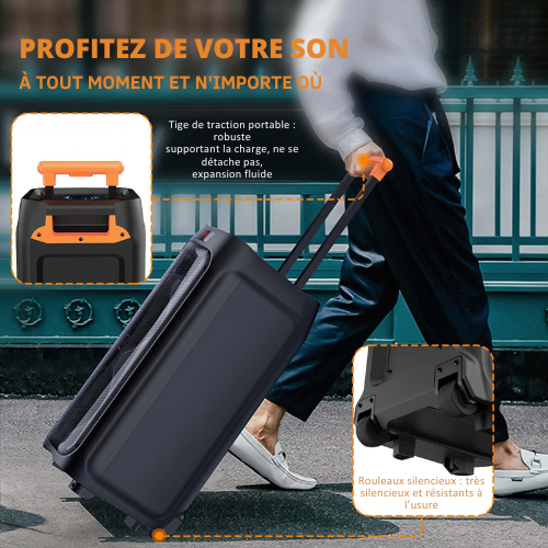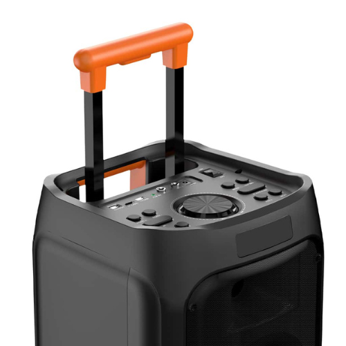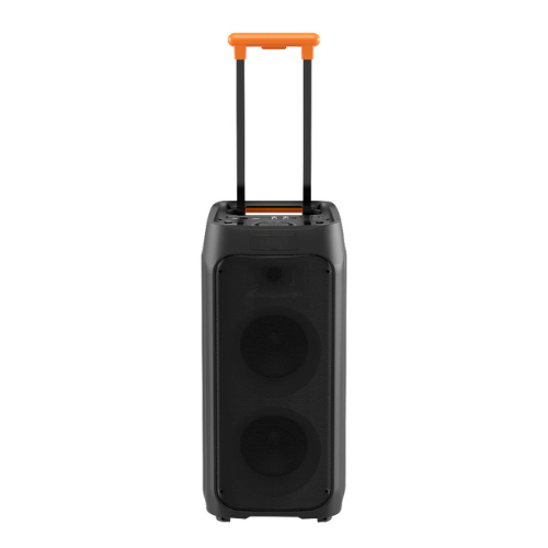 Conçue pour être mobile, la PowerBeat™ est dotée de roulettes silencieuses et d’une poignée télescopique permettant un transport simple et rapide. Sa batterie rechargeable de 4400 mAh assure jusqu’à 8 à 10 heures d’utilisation — idéale pour les soirées karaoké, les événements et les fêtes en extérieur.