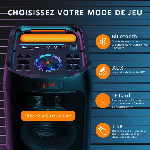 - Modes de Lecture : Bluetooth, AUX, USB, TF, FM