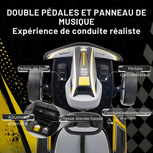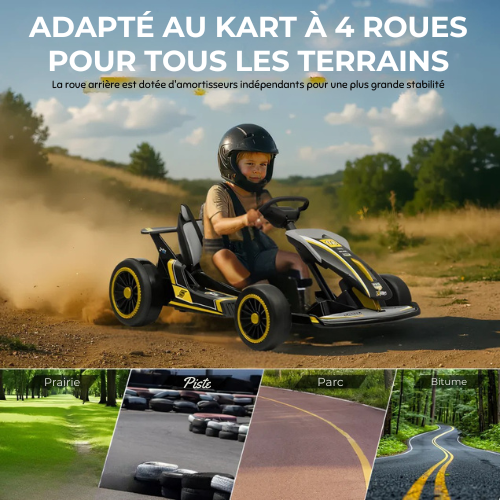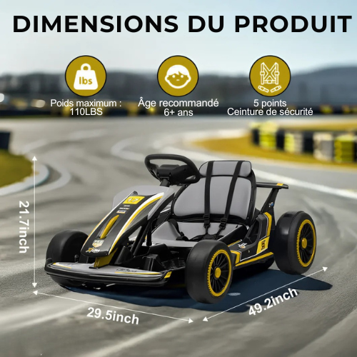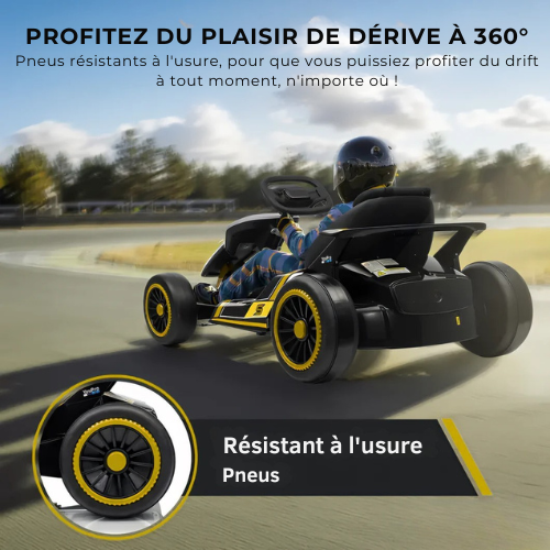 La batterie 24V 7Ah offre une autonomie adaptée aux sessions de jeu en extérieur, avec une puissance constante pour la conduite et le drift, sans recharges trop fréquentes.