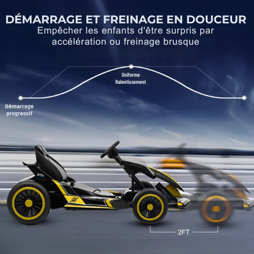 Le système de conduite comprend une pédale d’accélération et une pédale de frein indépendante. Le kart ralentit naturellement lorsque l’accélérateur est relâché, tandis que la pédale de frein permet un arrêt rapide et contrôlé.