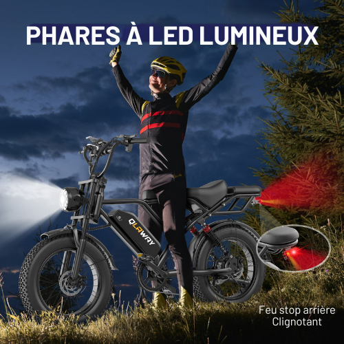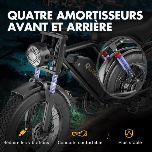 Profitez d’une conduite fluide sur l’asphalte, le gravier, le sable ou la neige grâce à la suspension hydraulique double et aux pneus larges 20 × 4.0 pouces. Le cadre en acier allié renforcé supporte jusqu’à 150 kg tout en offrant une maniabilité exceptionnelle. Que vous circuliez en ville ou sur les sentiers, VoltAero™ garantit une stabilité et un confort optimaux dans toutes les conditions.