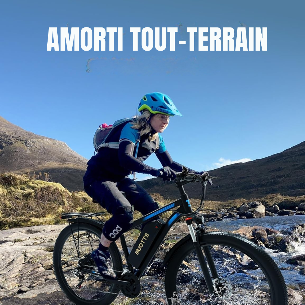 Roulez sans crainte avec des pneus gonflables 29″ × 2.125″ qui vous permettent d’ajuster la pression pour un équilibre parfait entre confort, adhérence et efficacité. Une protection du dérailleur arrière sécurise la transmission sur les porte-vélos ou chemins escarpés. Sa conception résistante à l’eau IPX4 vous garde en mouvement même sous une légère pluie.