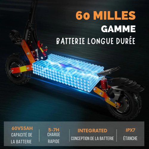 - Batterie 60V / 35Ah pour une autonomie allant jusqu’à 96 km